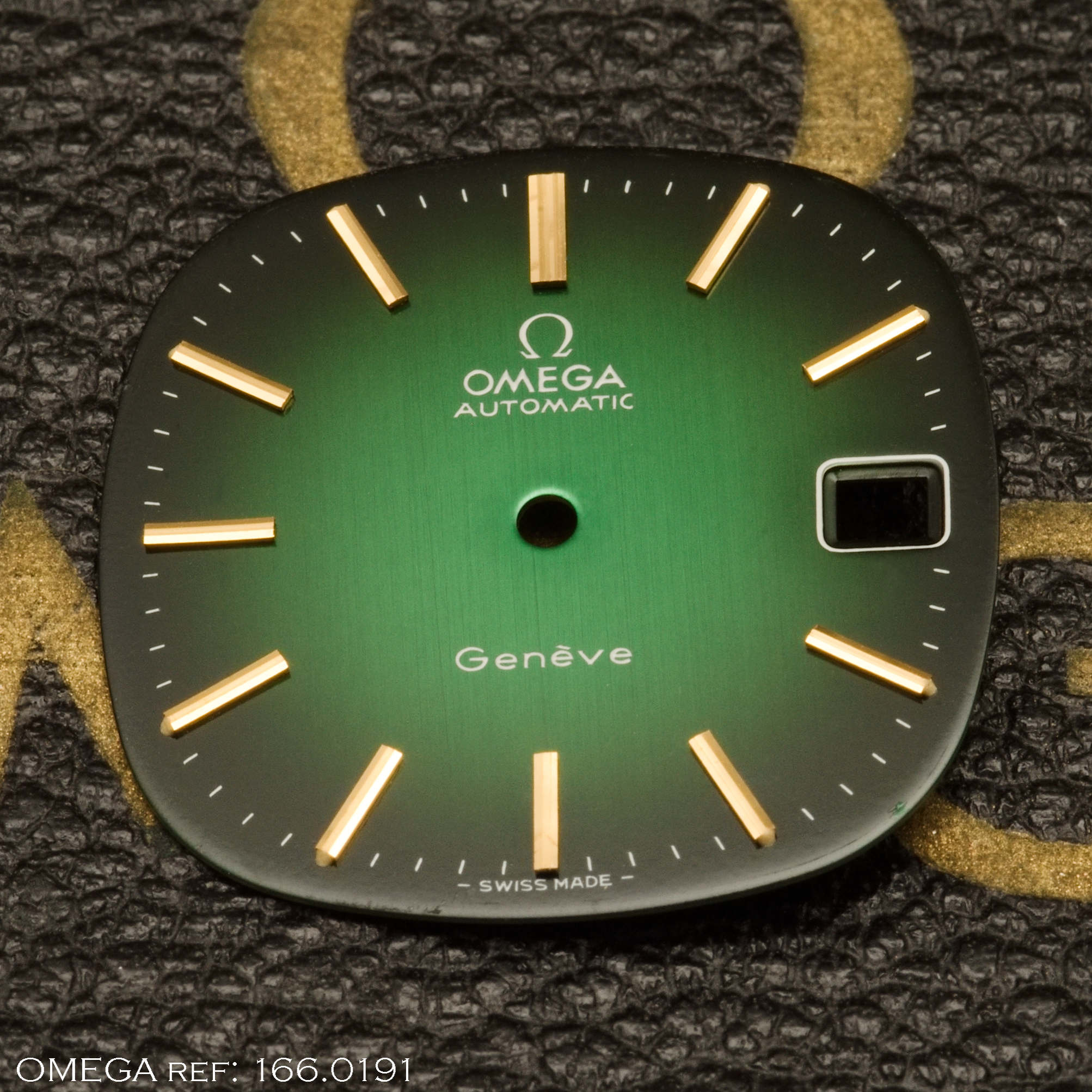 OMEGA original Geneve dial in perfect NOS condition. Shaded green with golden indices. Comes in factory packaging.