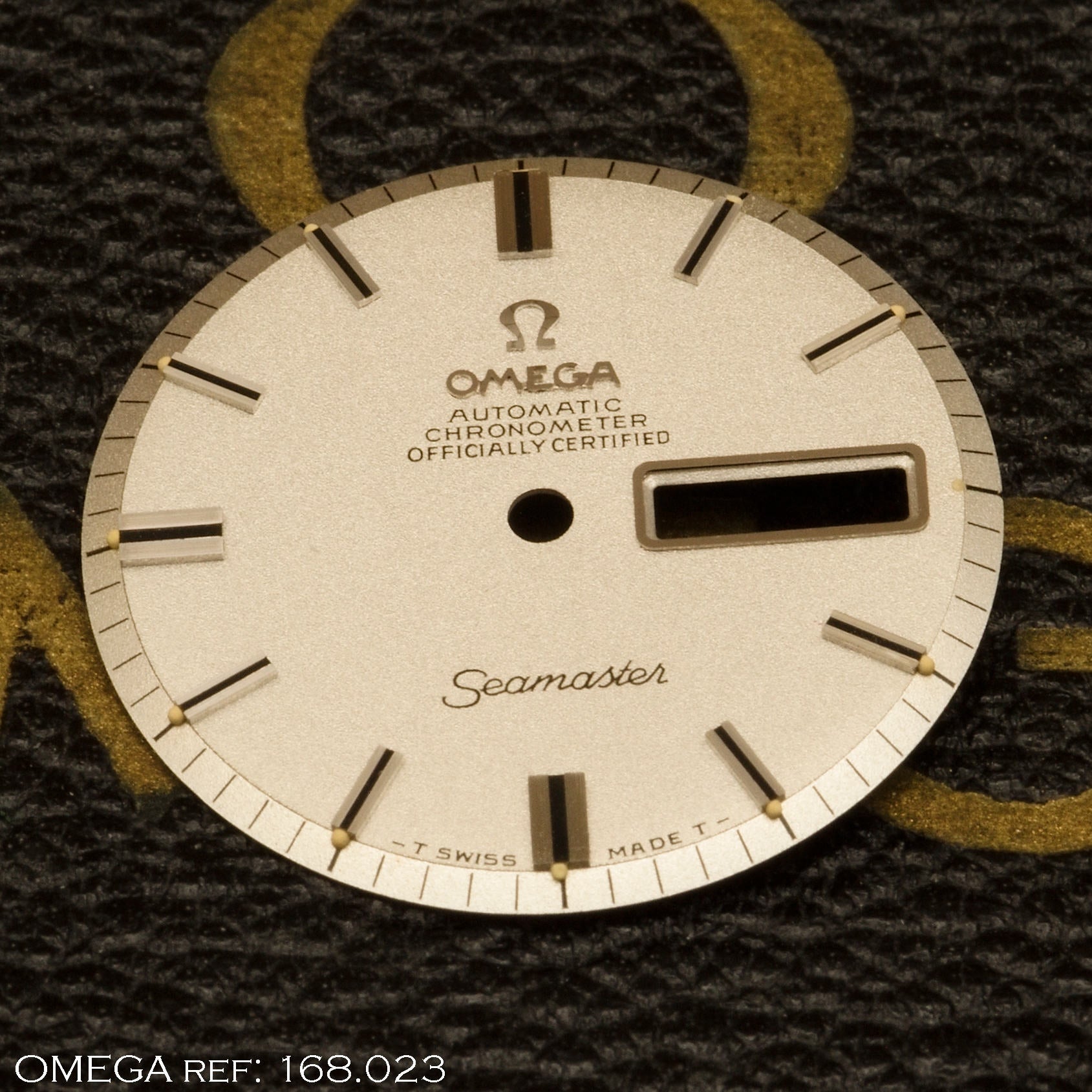 Täydellisessä NOS-kunnossa oleva OMEGA Genève -alkuperäinen kellotaulu. Hopeoitu mustilla/kultaisilla indekseillä.